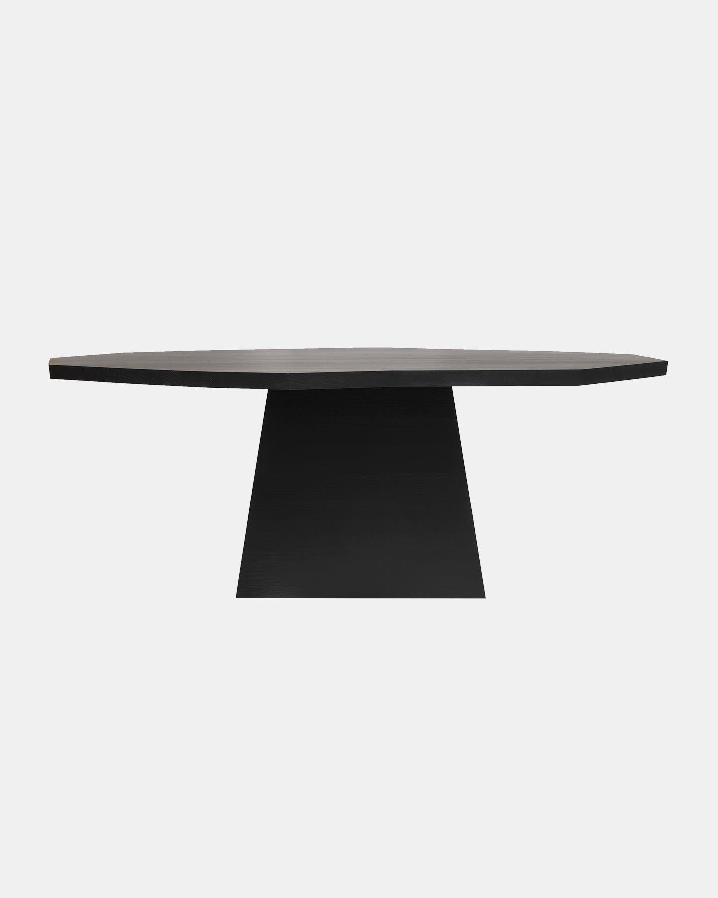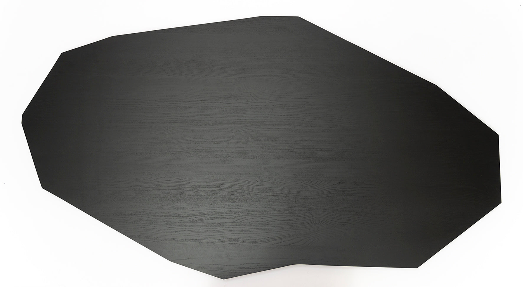 Et spisebord med asymmeterisk plate som gjør hele bordet unikt og noe for seg selv! Bordet er laget av sortbeiset eiketre og er et solid massivt bord.