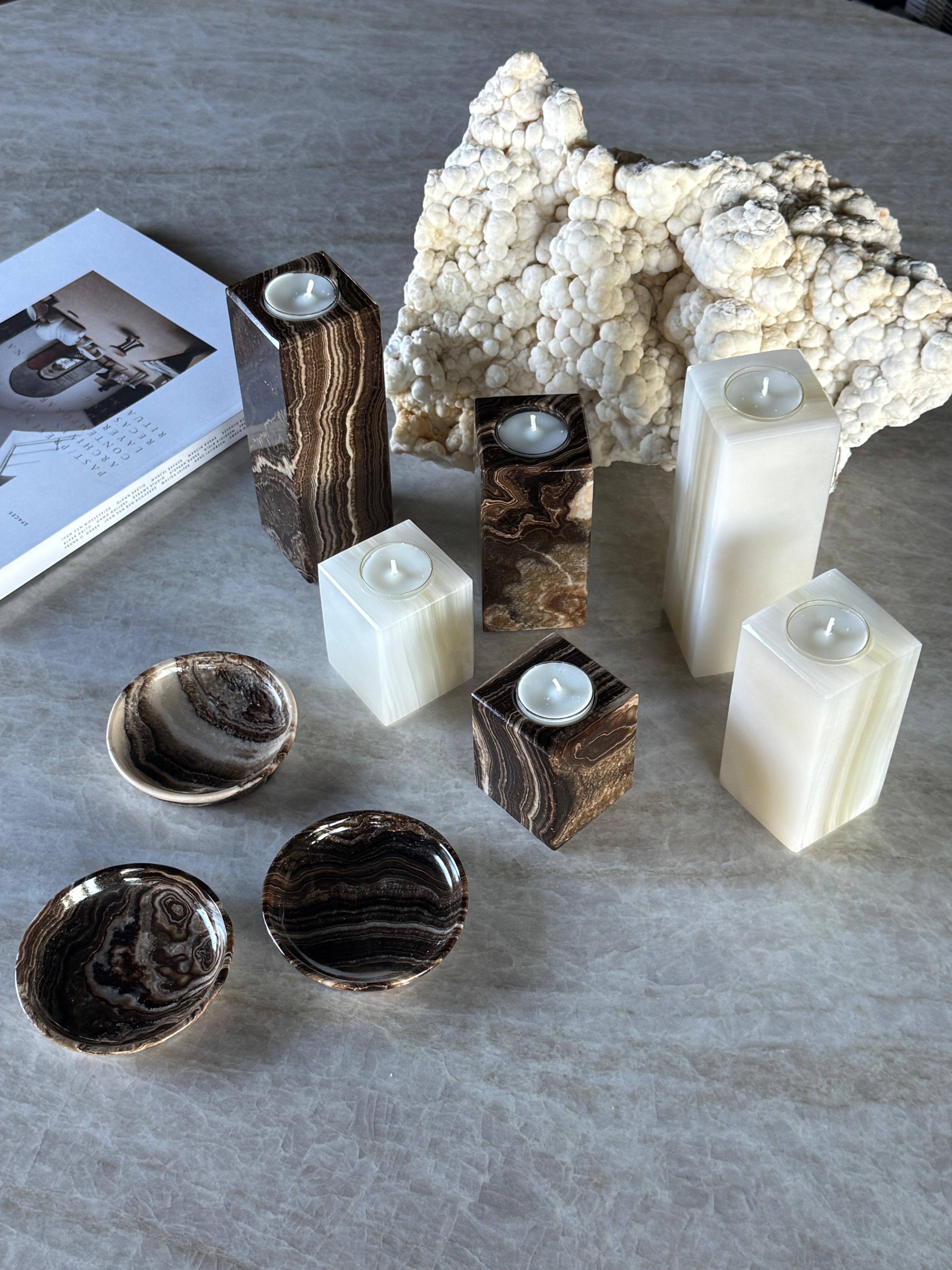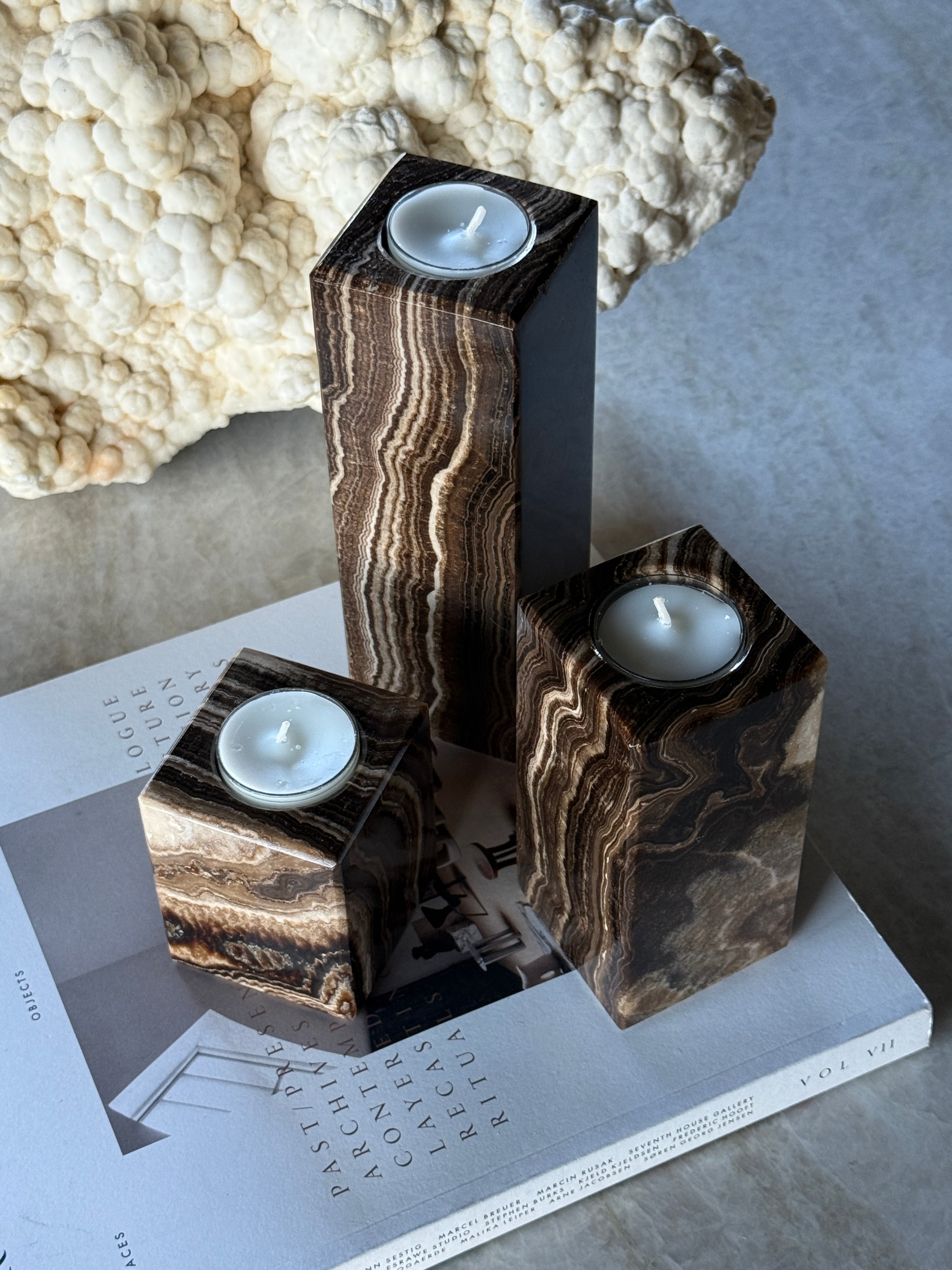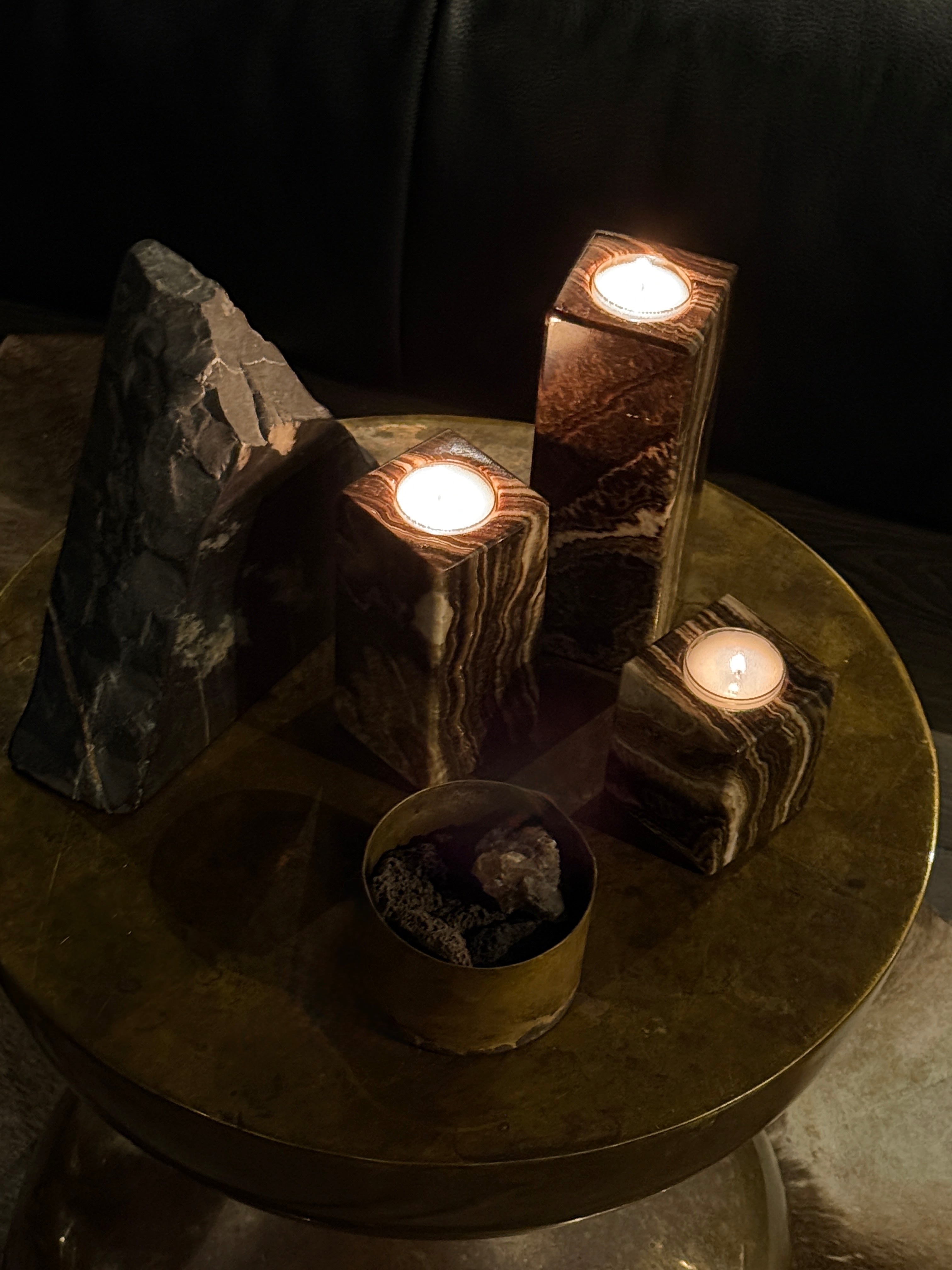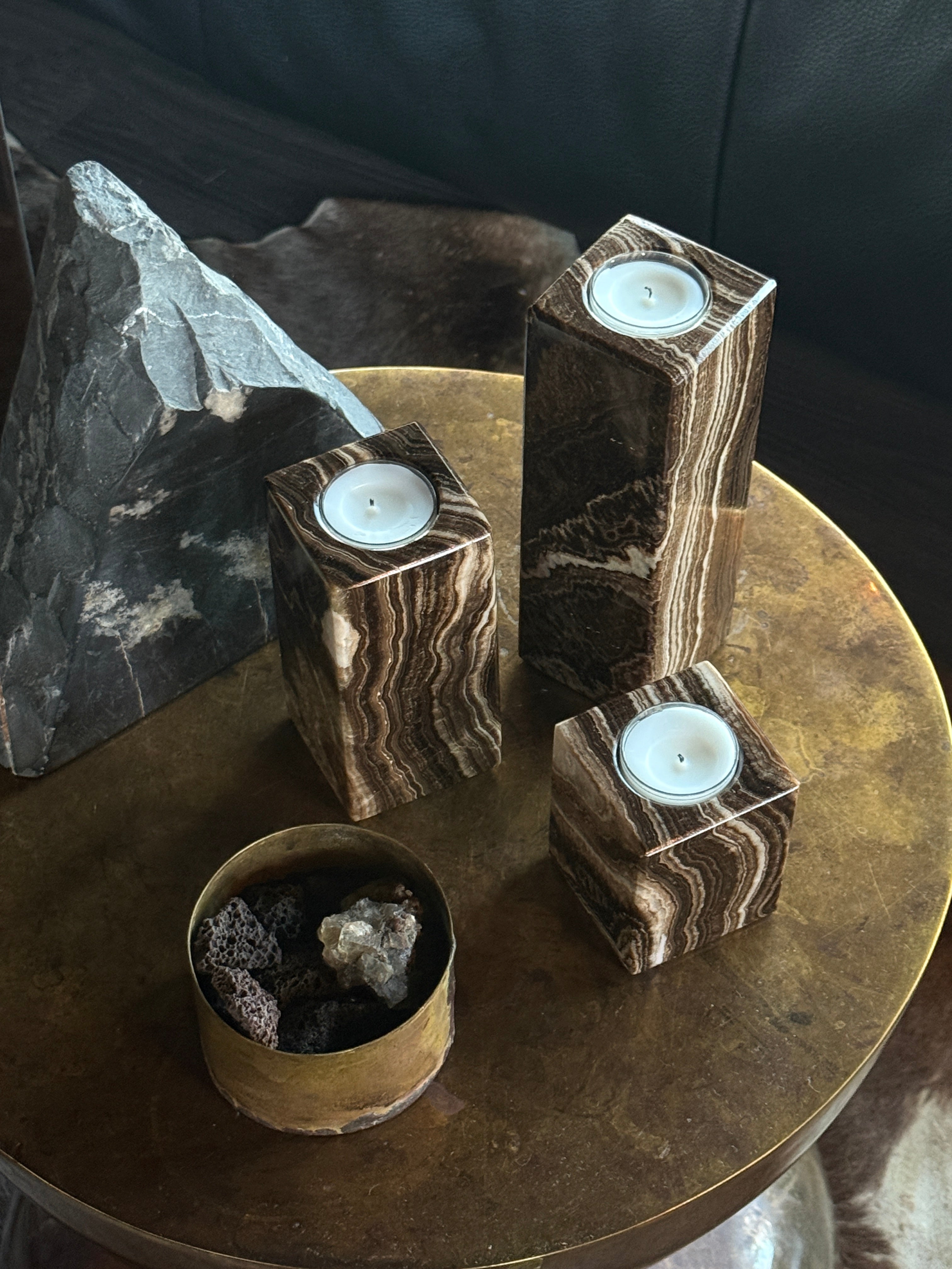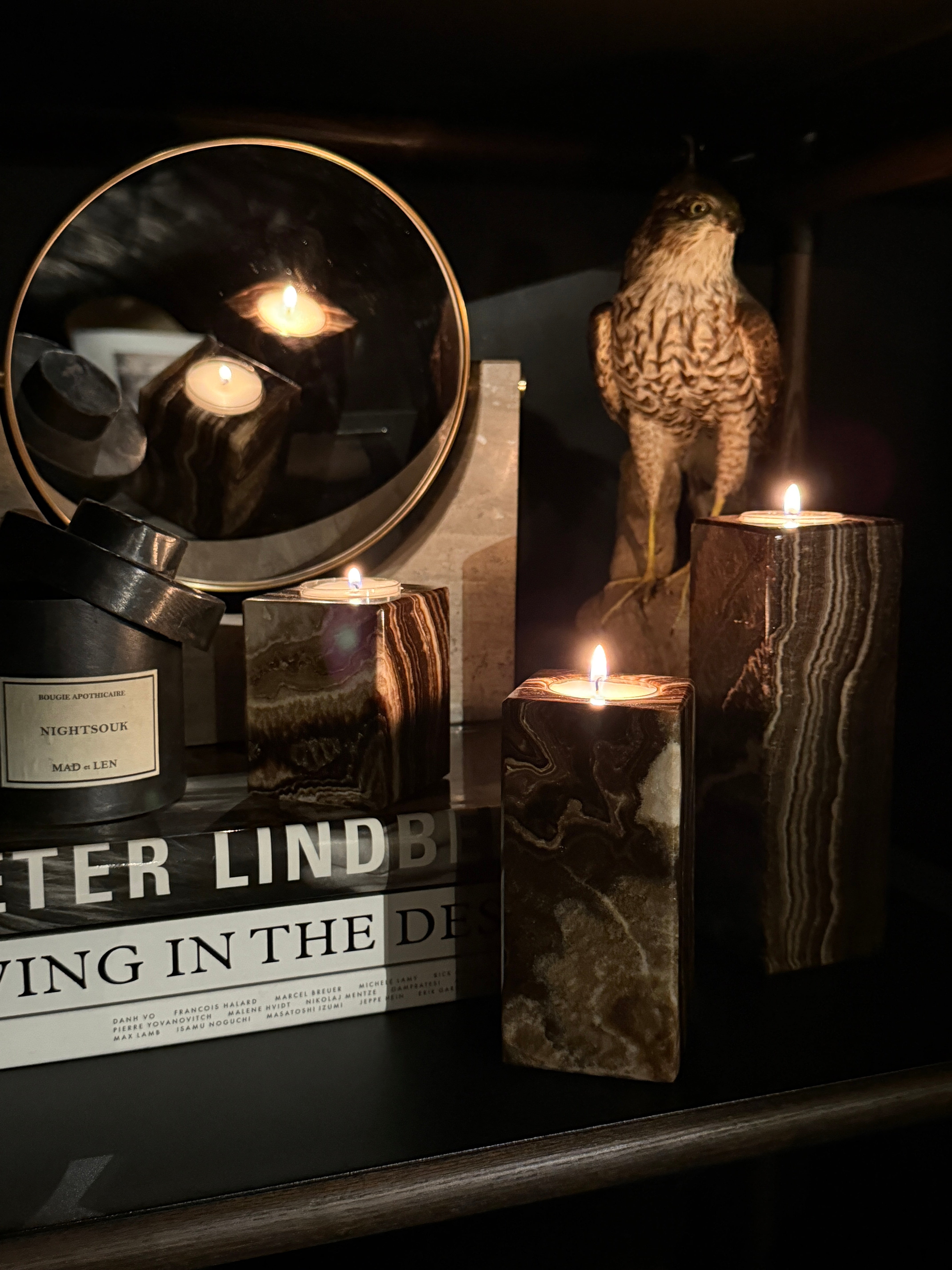 Onyx er et naturmateriale, og hver telysholder er unik. Farge og mønster vil variere noe.
