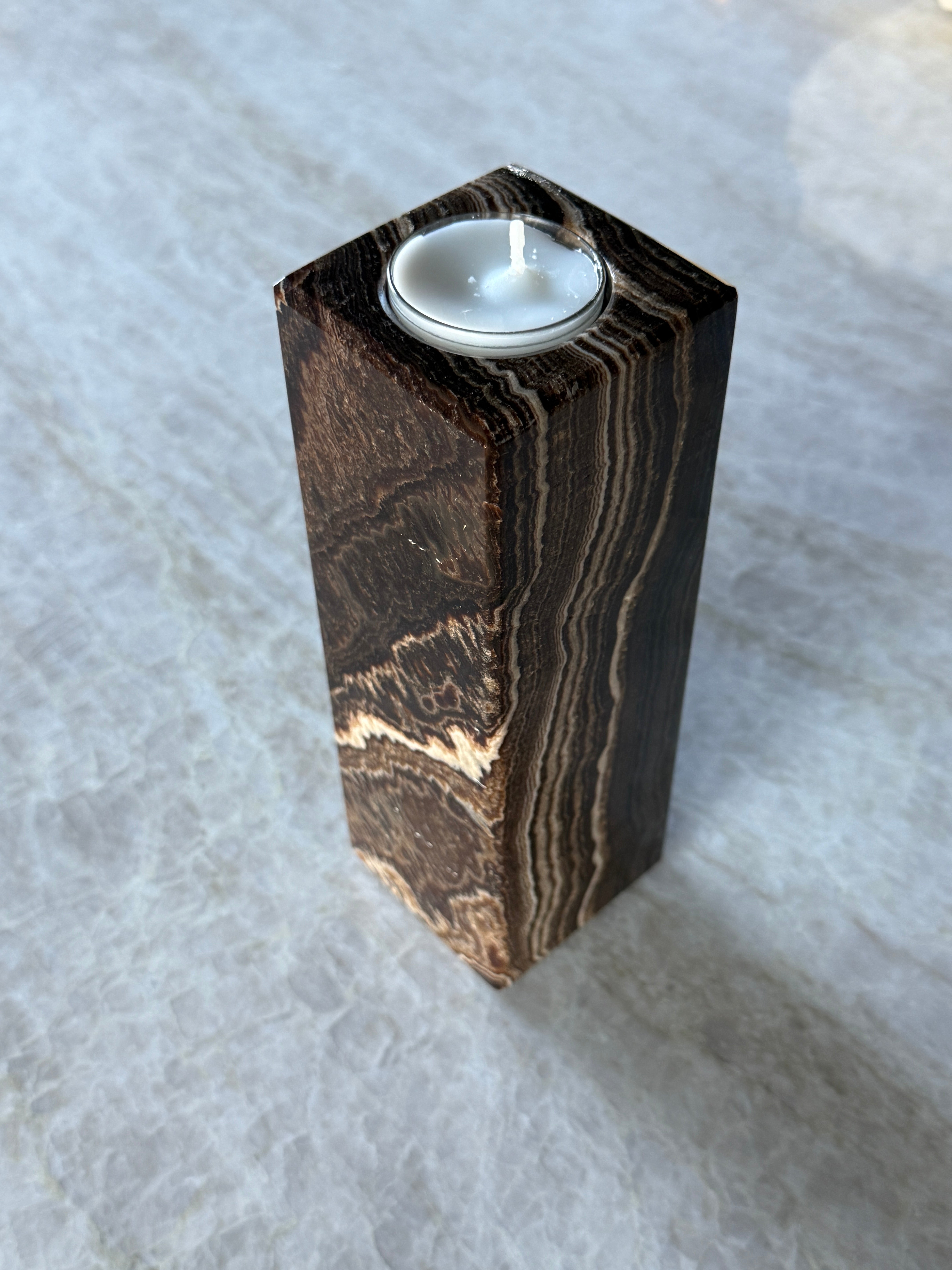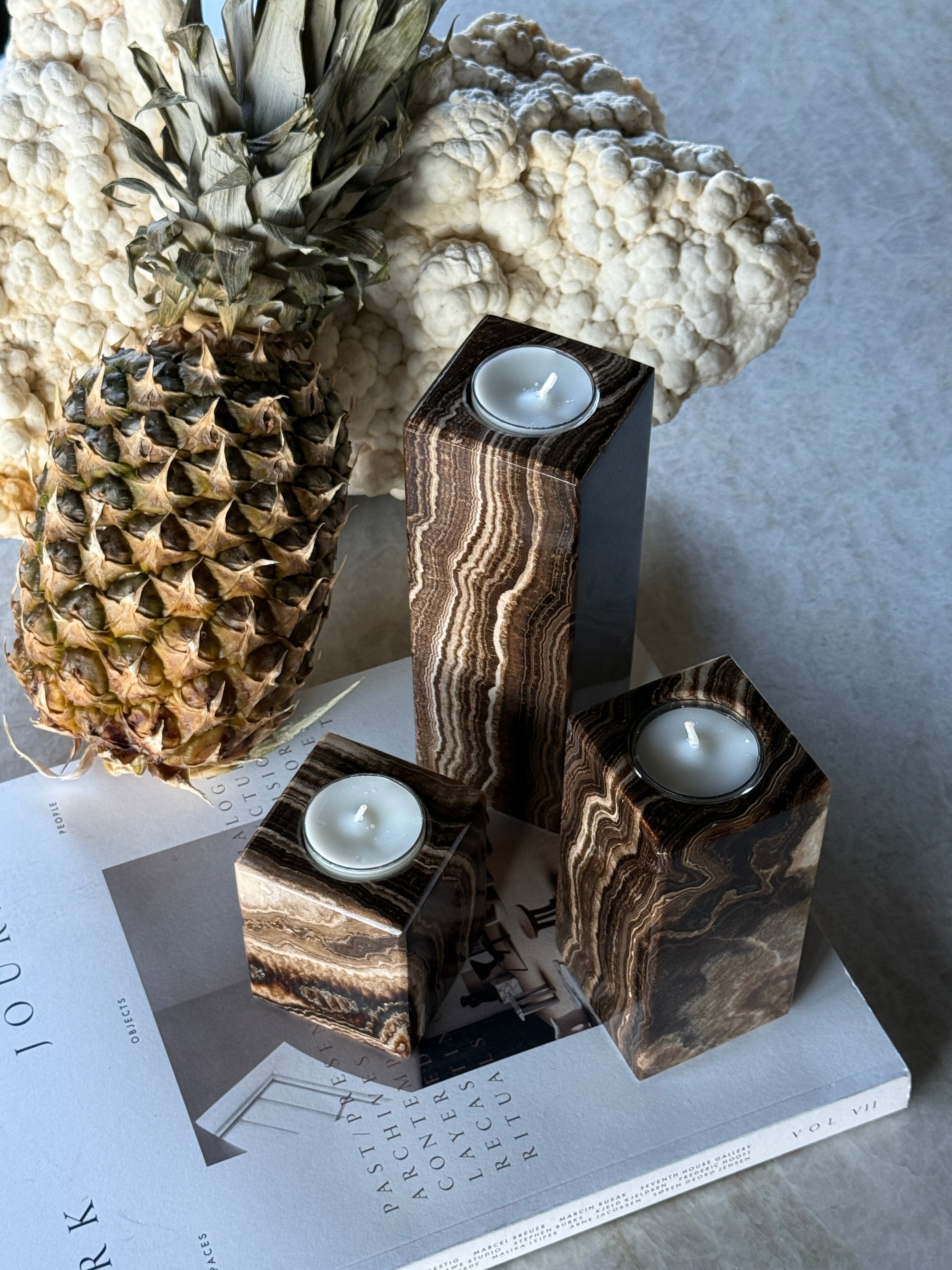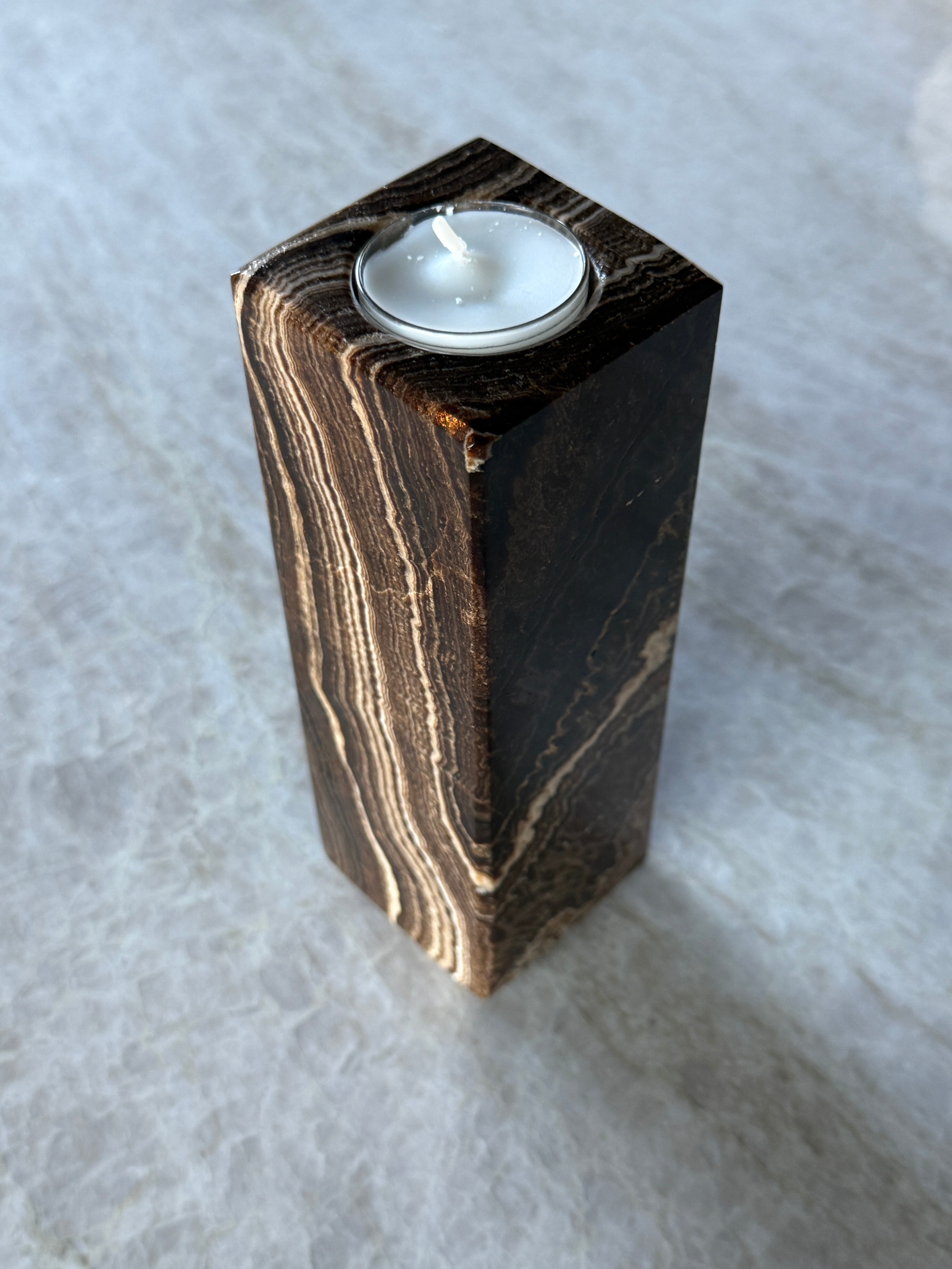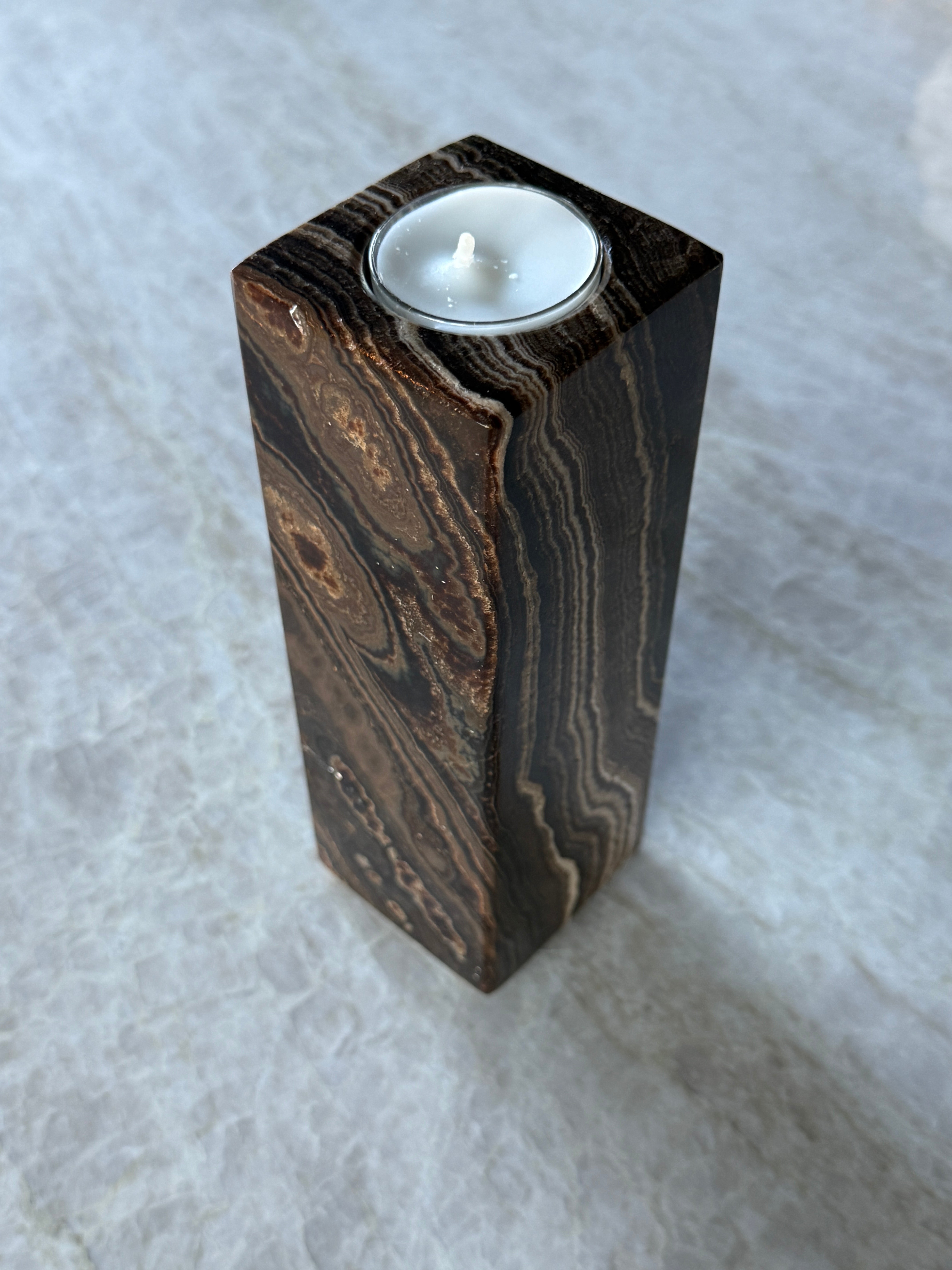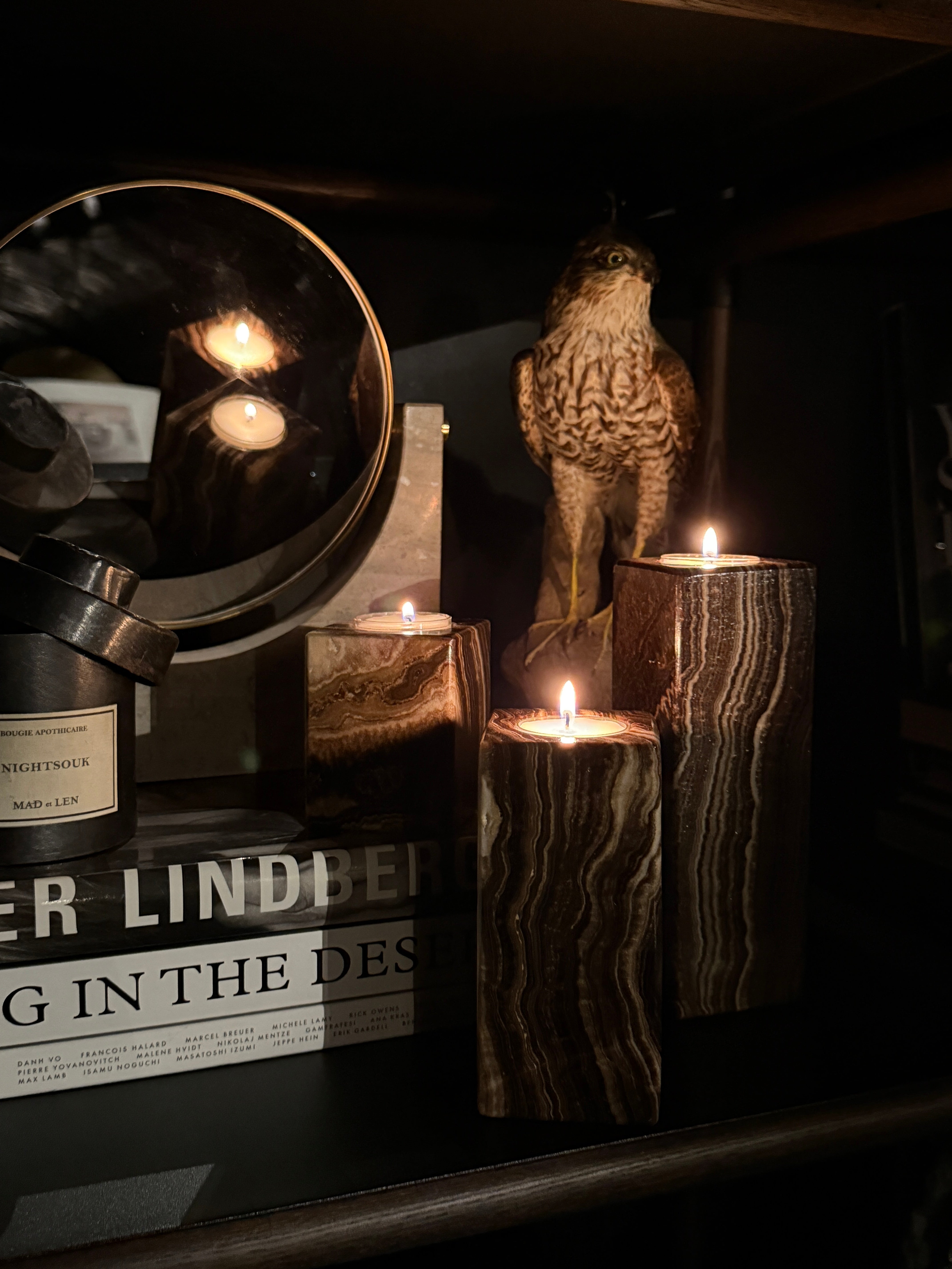 Onyx er et naturmateriale, og hver telysholder er unik. Farge og mønster vil variere noe.