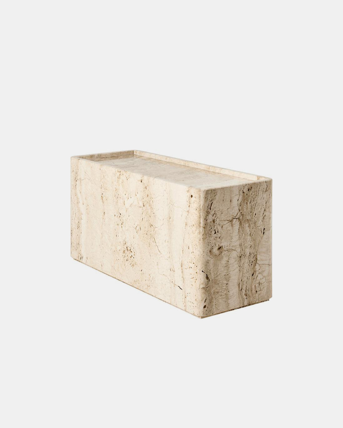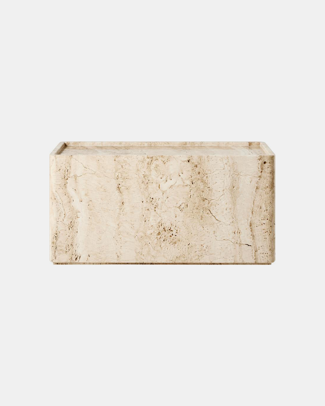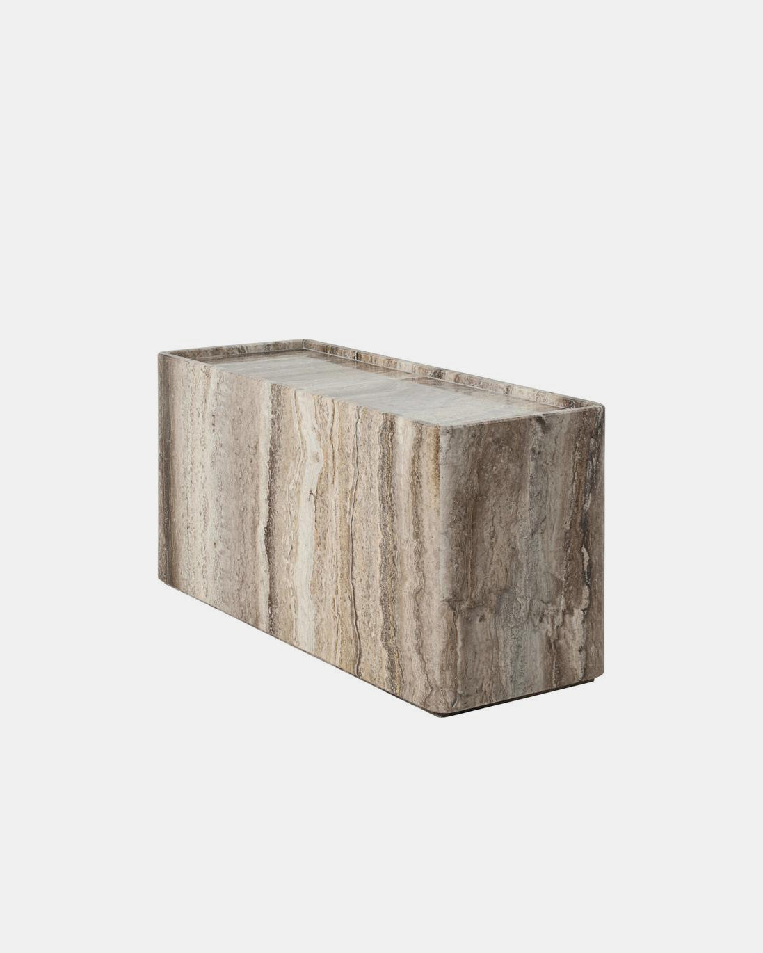 En hevet kant rundt bordplaten skaper et praktisk brett, ideelt for å vise frem objekter eller plassere glass. De myke, polerte kantene og hjørnene gir bordet et skulpturelt uttrykk og fremhever travertinens naturlige skjønnhet.