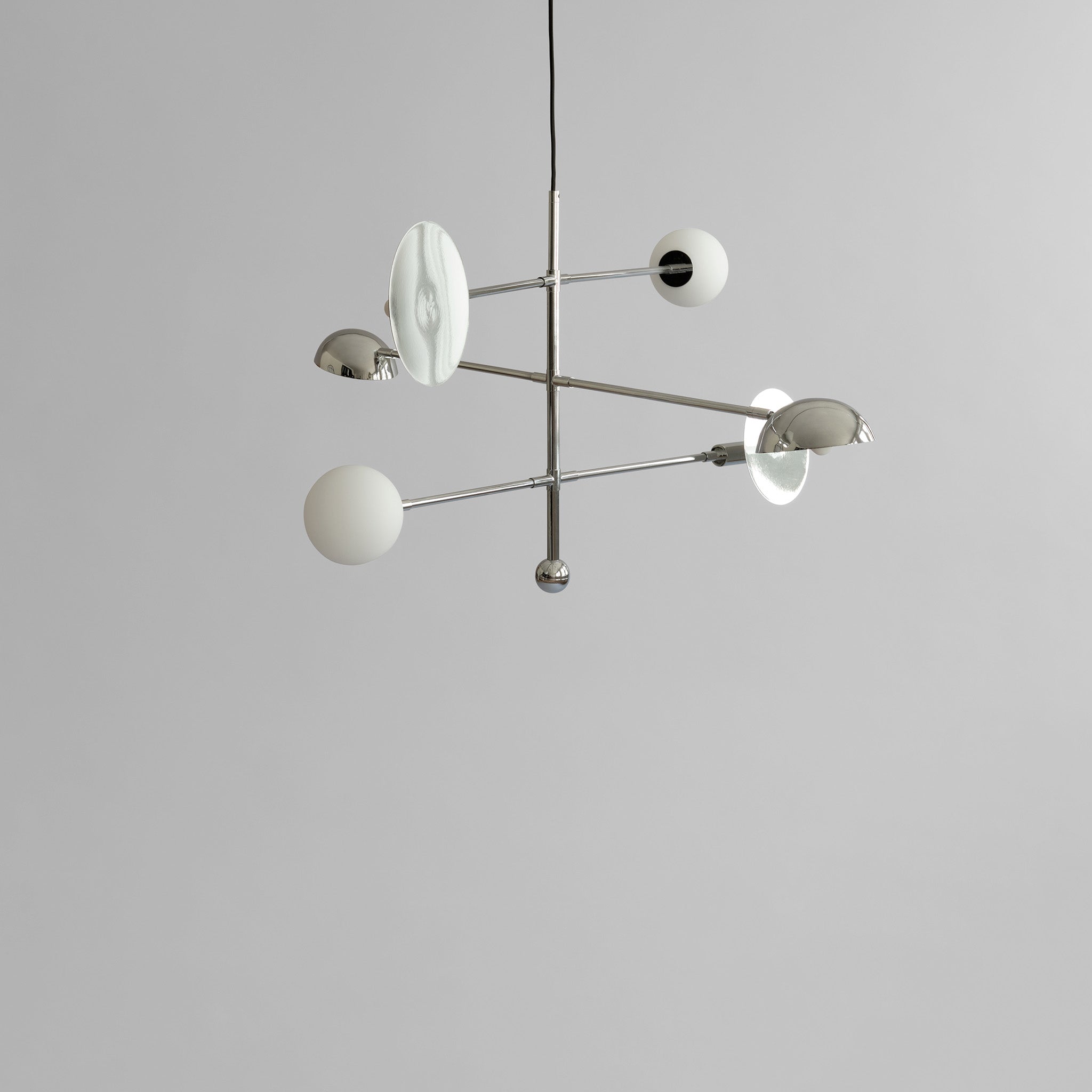 Inspirert av 70-talls futuristisk design og romalder, handler Sahn Chandelier om bevegelse og fleksibilitet. Hver lampearm og lampeskjerm kan snu og vri seg i forskjellige retninger, og understreker en unik og skulpturell belysning av rommet.