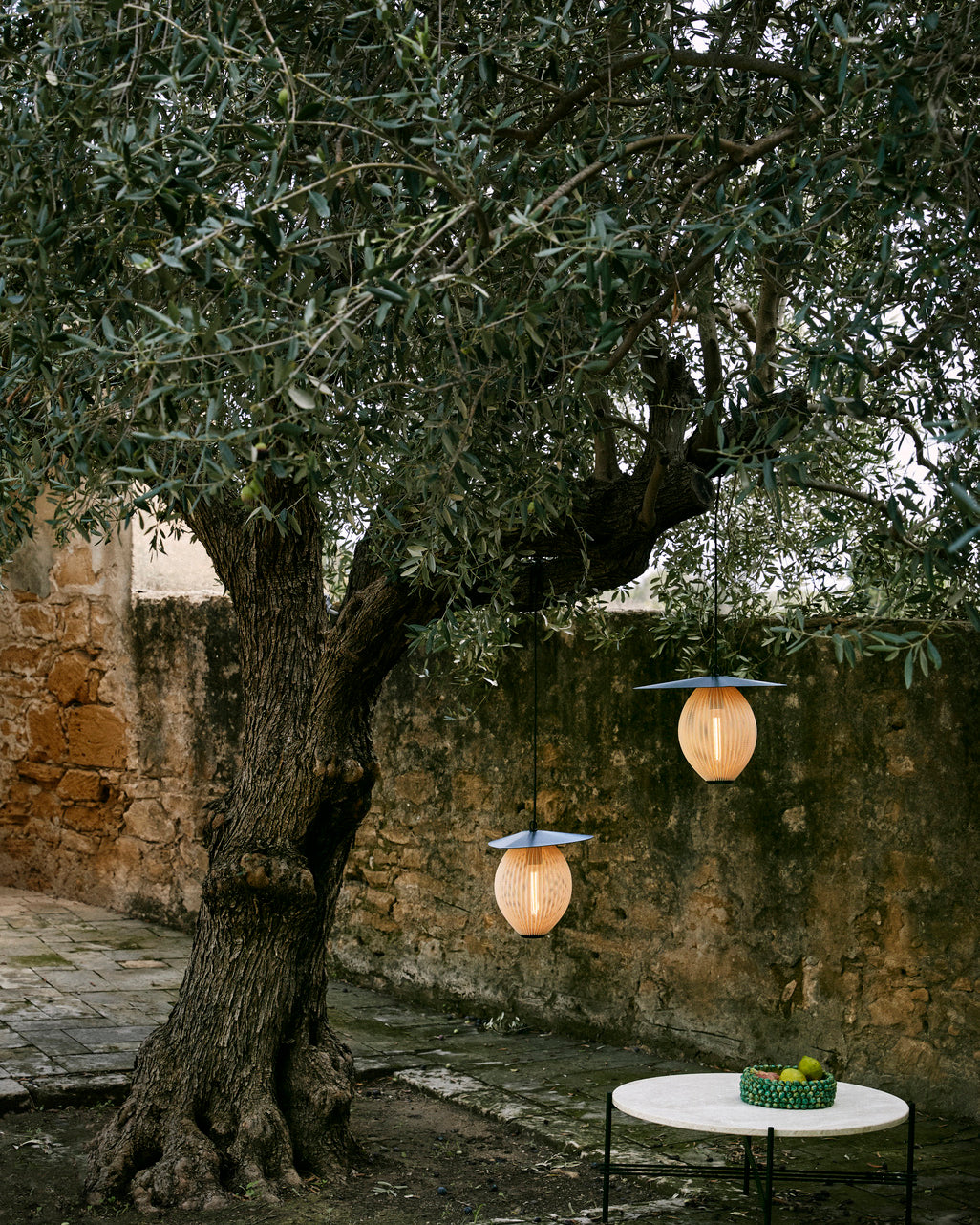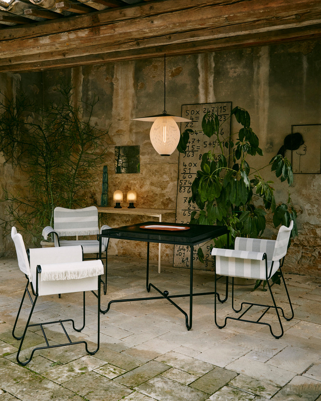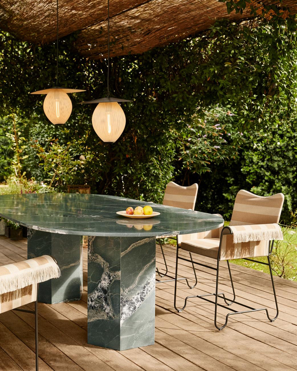 Pendelen kommer i to størrelser og tilbys i semi-matte farger: Cream White og Mustard Gold. Begge variantene er sertifisert for utendørs bruk og gir et mykt og stemningsfullt lys – perfekt for lange sommerkvelder.