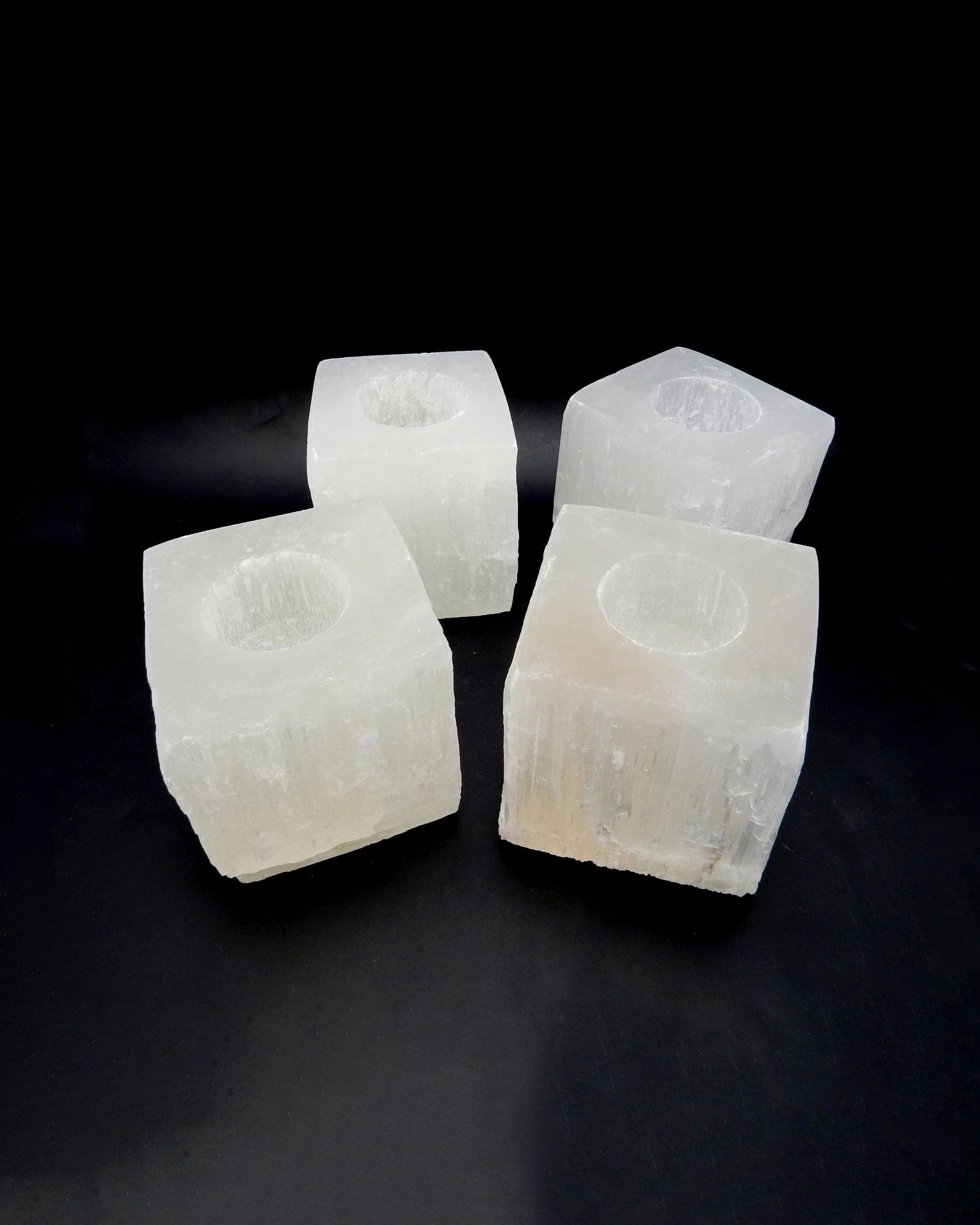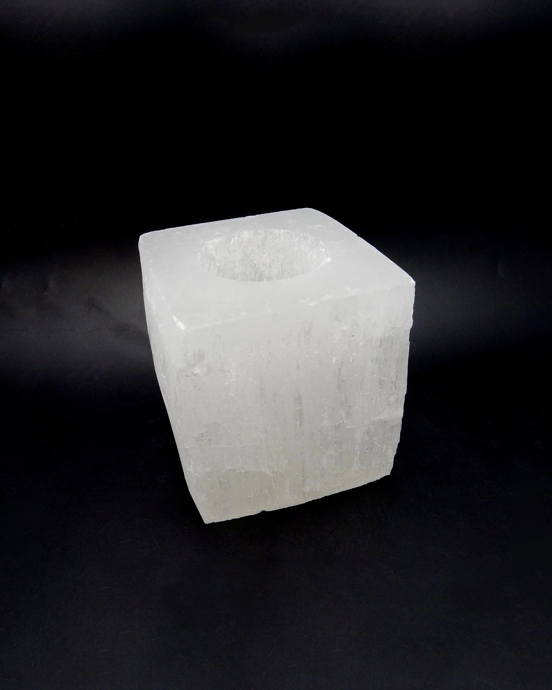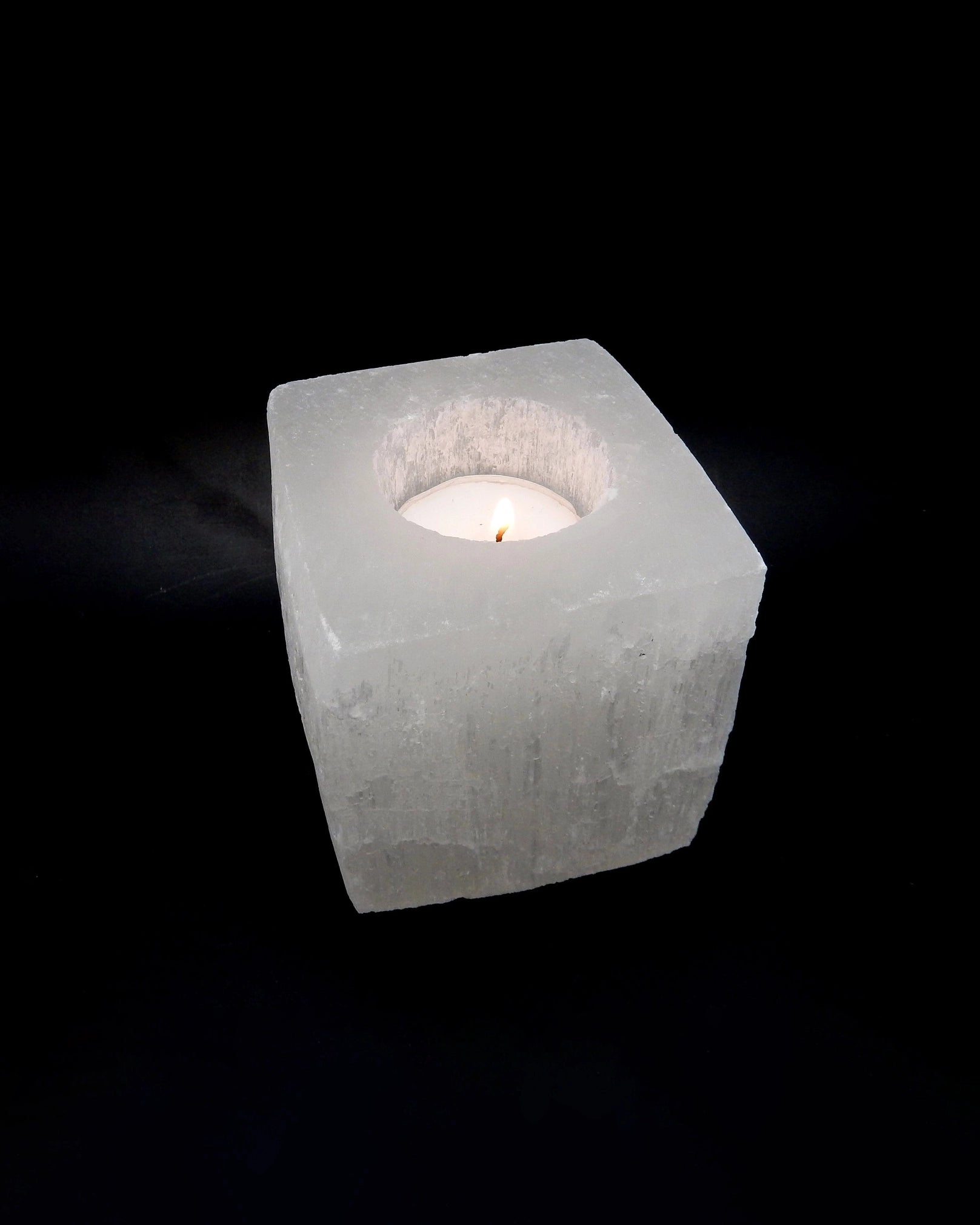 Denne vakre selenitt-lysestaken er formet som en kompakt kube med et utskjært senter som passer perfekt til et telys. Den gir et mykt, harmonisk lys og passer i ethvert rom – perfekt som gave eller som et stemningsskapende innslag i hjemmet.