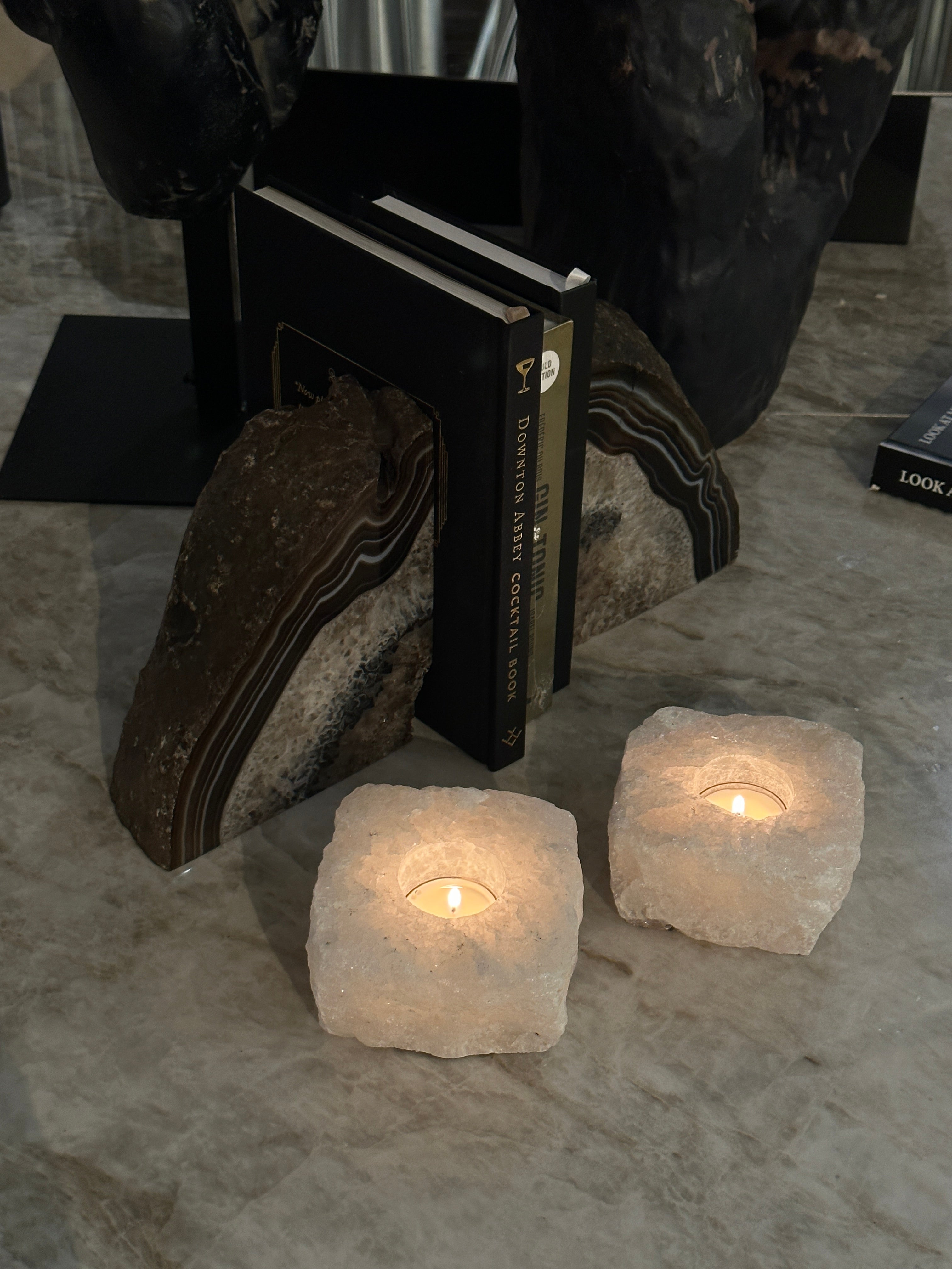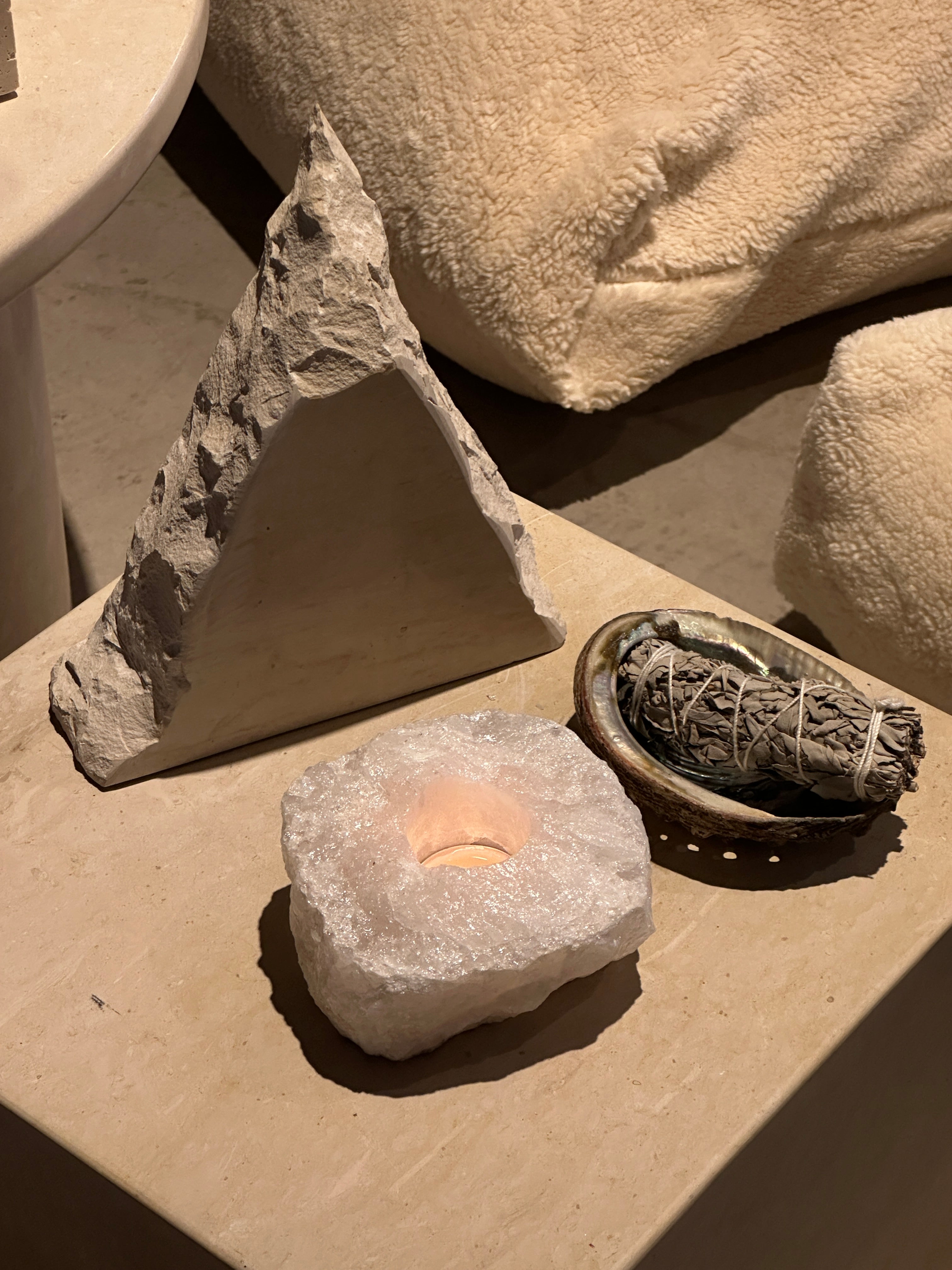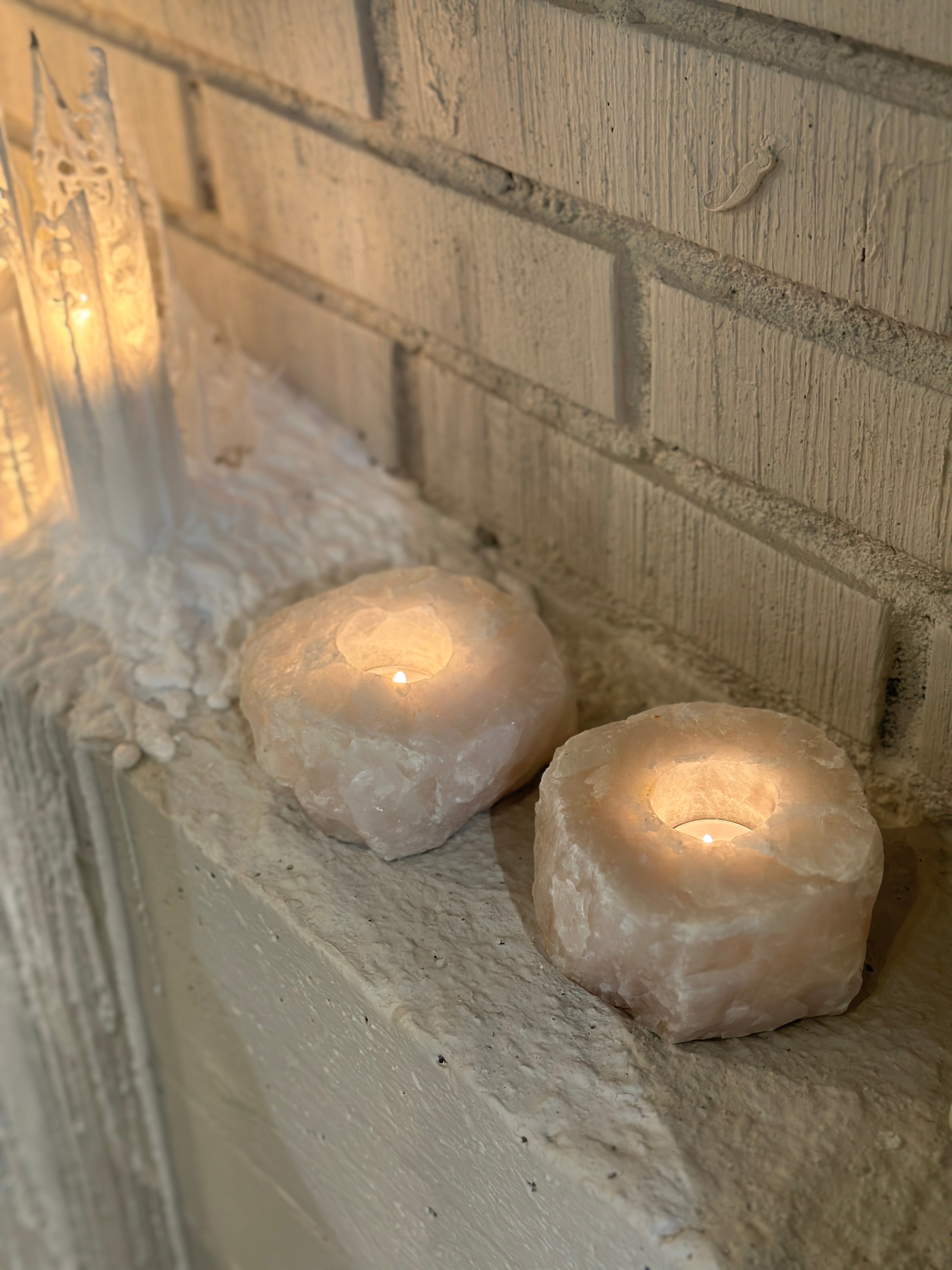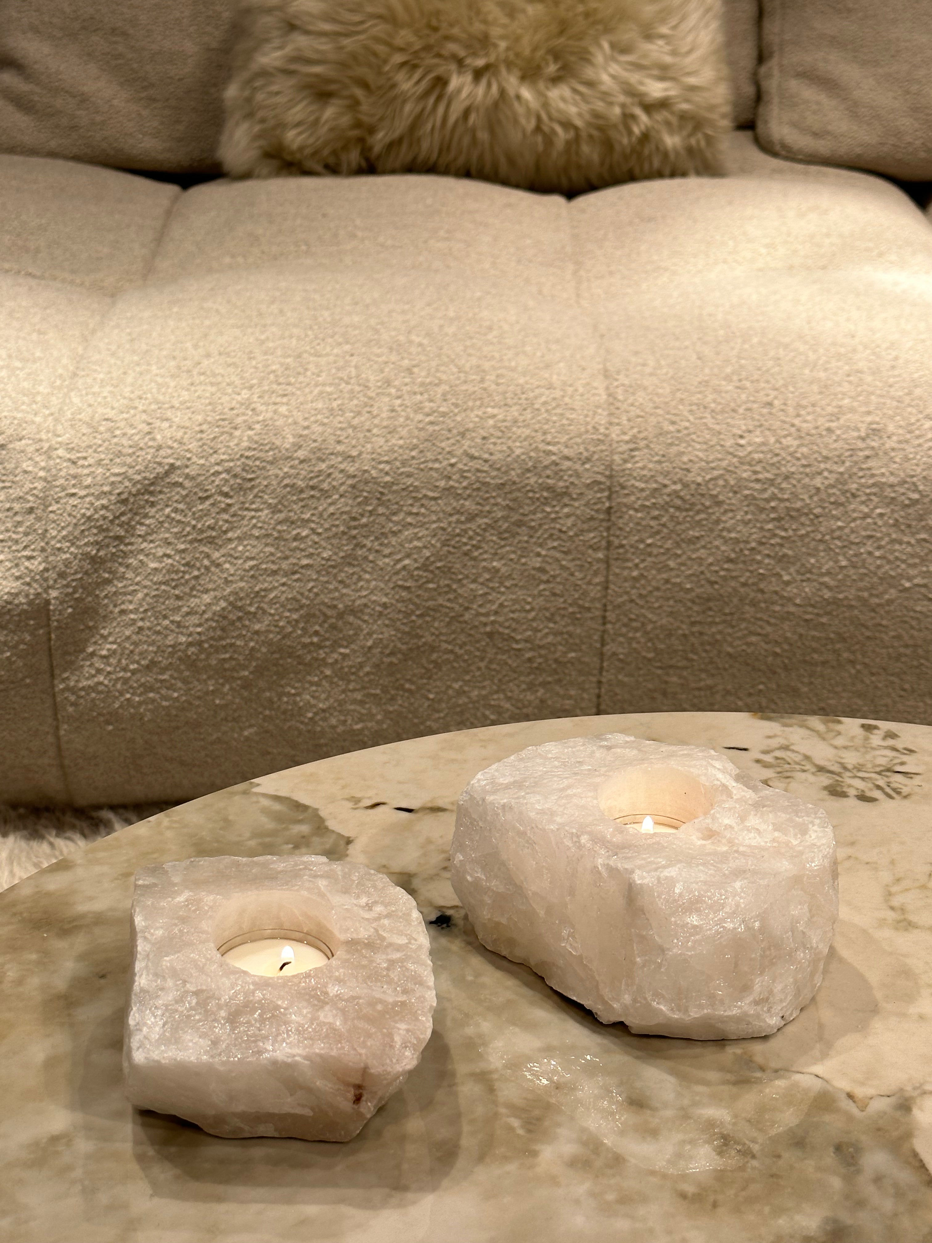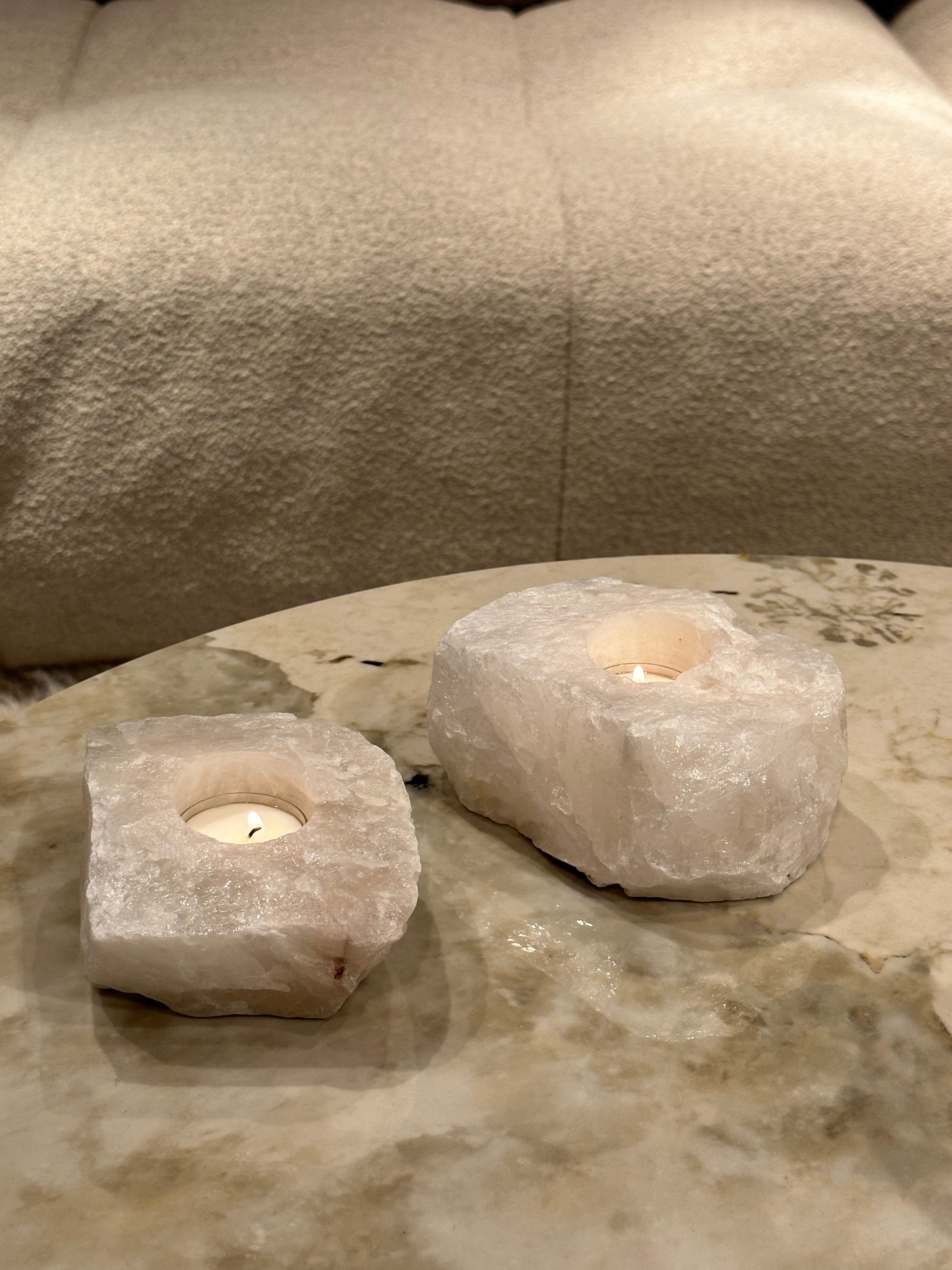 Denne telysholderen er laget av naturlig hvit kvarts, formet i sin rå og kraftfulle steinstruktur. Den matte, krystallinske overflaten gir et elegant og organisk uttrykk, og når et telys tennes, skaper kvartsen et rolig og behagelig lys som sprer varme i rommet.