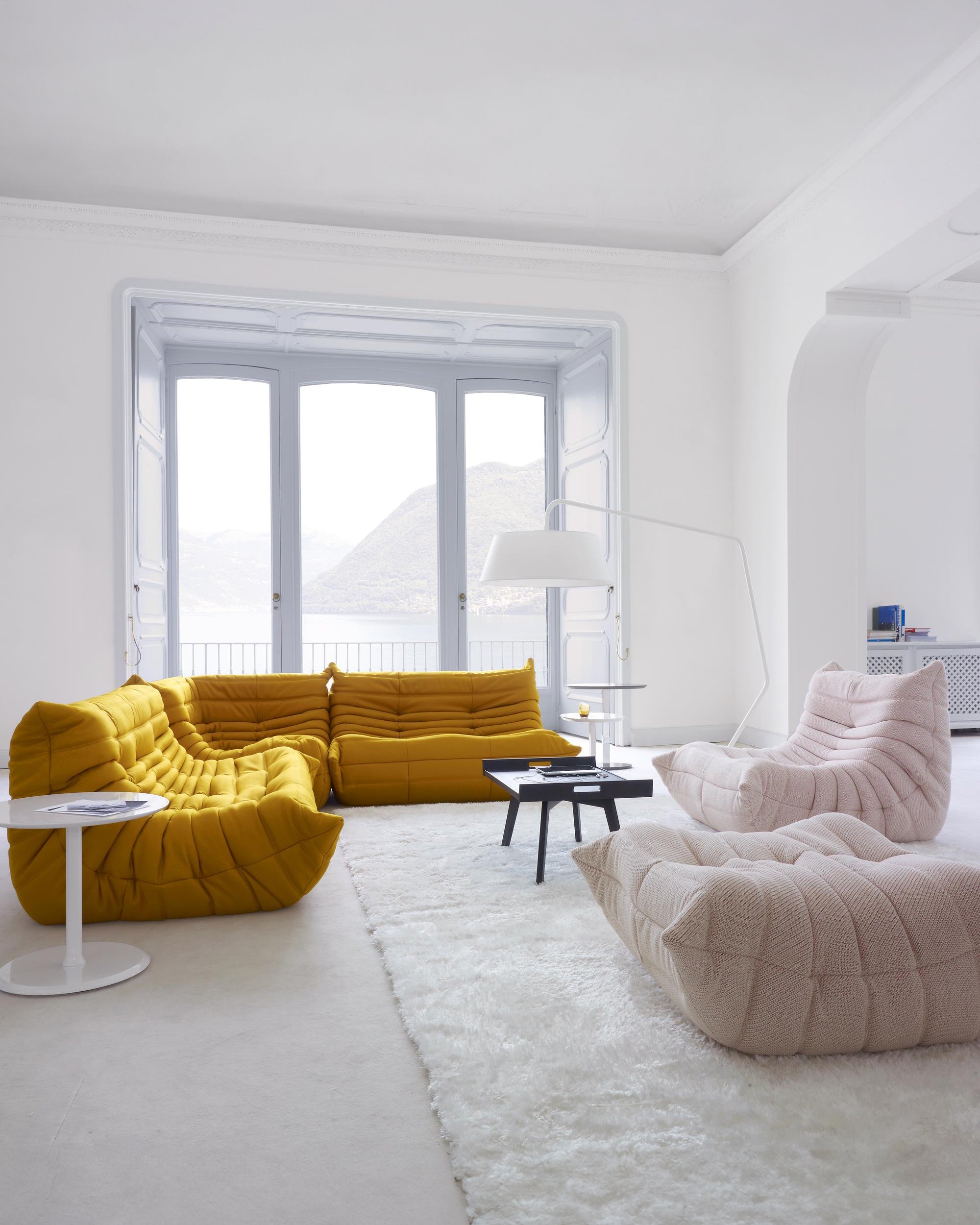 Togo er tilgjengelig som loungestol, toseter, treseter, lounge, treseter med armlene og puff. Alle i et bredt utvalg av farger og utførelser, fra skinn til stoff. For å se komplett utvalg av tekstiler se her. Denne lenestolen med sitt unike design vil løfte ethvert rom.